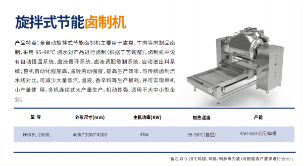 全⾃动旋拌式节能⻧制机主要⽤于禽类、⽜⾁等⾁制品⻧制,采⽤ 95-98 °C ⻧⽔对产品进⾏⻧制(根据⼯艺调整),⻧制机中设有⾃动恒温系统、⻧液循环系统、⻧液调配熬制系统、⾃动进出料系统;整机⾃动化程度⾼,减轻劳动强度,提⾼⽣产效率,与传统⻧制流⽔线对⽐,可减少⼤量蒸汽、⻧液、⾹⾟料等⽣产损耗,并可实现单机⼩产量使 ⽤、多机连续式⼤产量⽣产,机动性强,适⽤于⼤中⼩型企业。